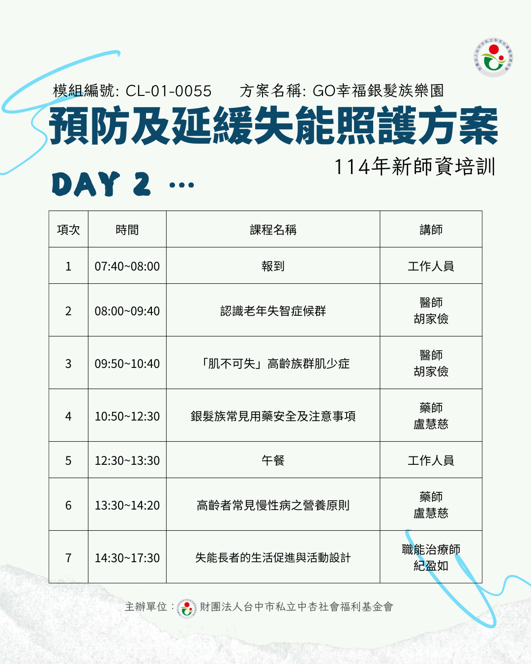 本會依據衛生福利部114年度「預防及延緩失能照護服務方案—新師資人才培訓計畫」,