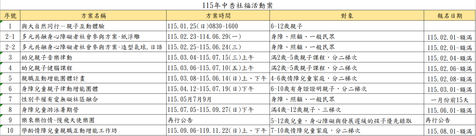 今年115 年中杏基金會預期的社福活動時刻表,歡迎大家踴躍參與。也多多關注我們的社群獲得第一手的資訊。
