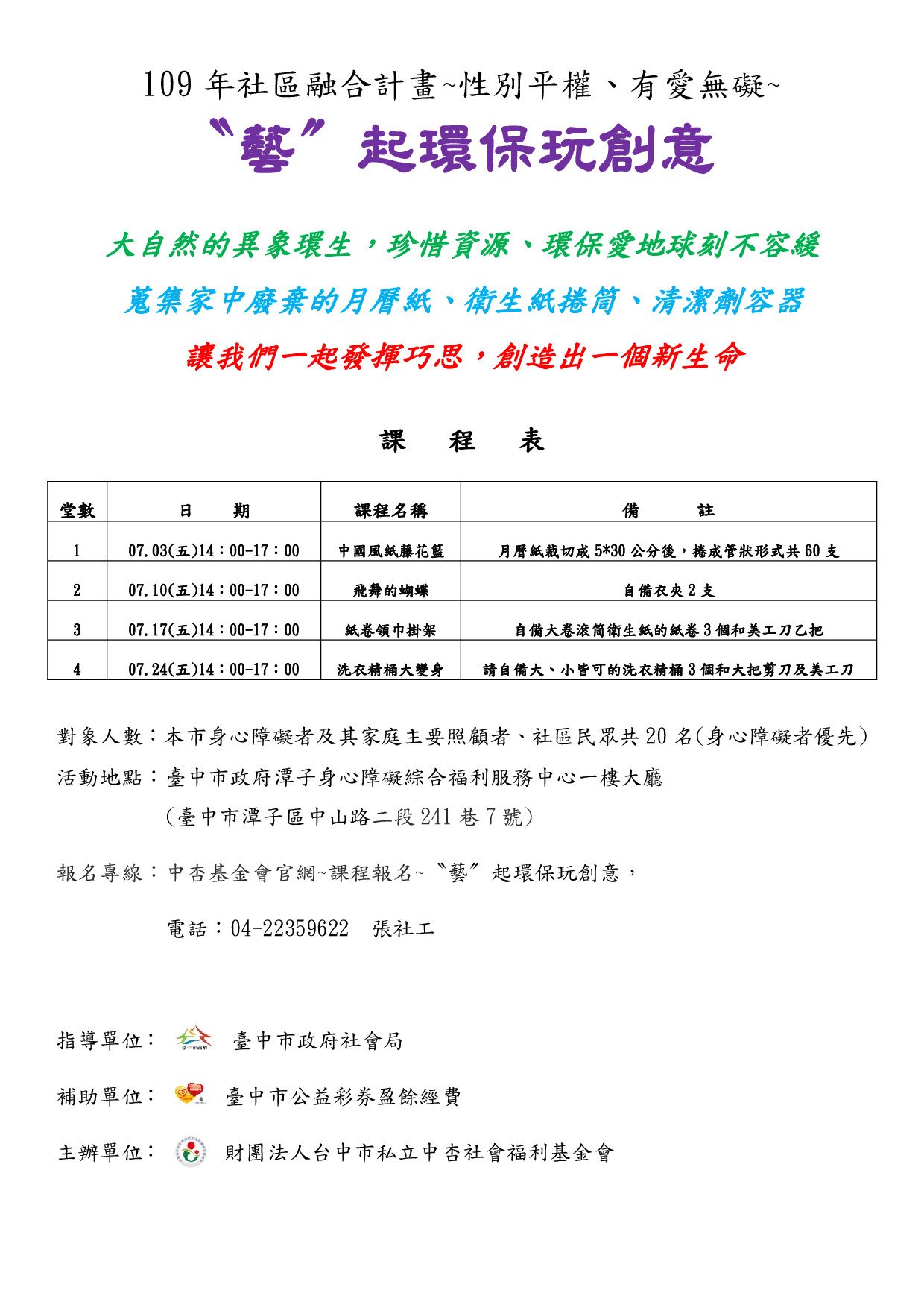 環保愛地球不只是一個標題或口號,而且地球上有無數的環保問題,也是現代人的機會,更值得我們去思考。如何讓可再利用的物品重複或創造出新生命,在企業界已將寶特瓶、咖啡渣轉換成機能性布料,是資源再利用的成果。本會基於環保責任及讓可用物資重複使用或創造出新生命,藉由社區融合計畫讓身障與社區民眾,將自家中的可用資源重新發揮新創意,如:月曆紙、廣告紙、大卷滾筒衛生紙的紙卷,清潔劑空瓶……等等,都可以經過手工創意,開創出新生命。