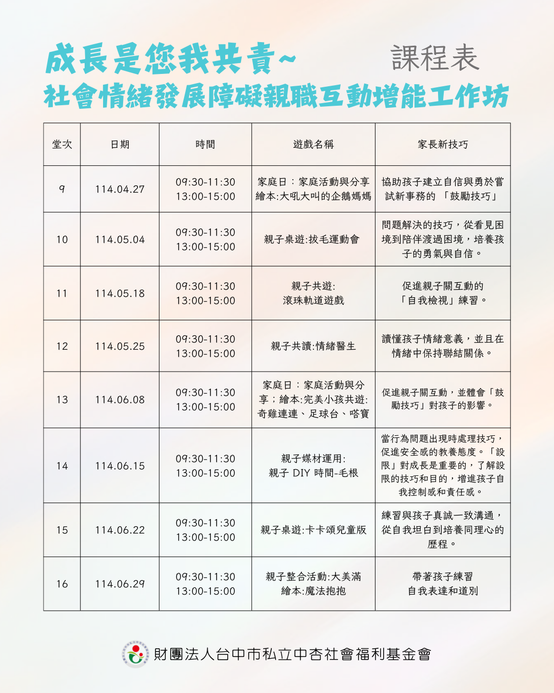 針對情緒發展遲緩的孩子提供支持,協助家長了解孩子的需求,增進接納與理解,營造和諧的親子關係。