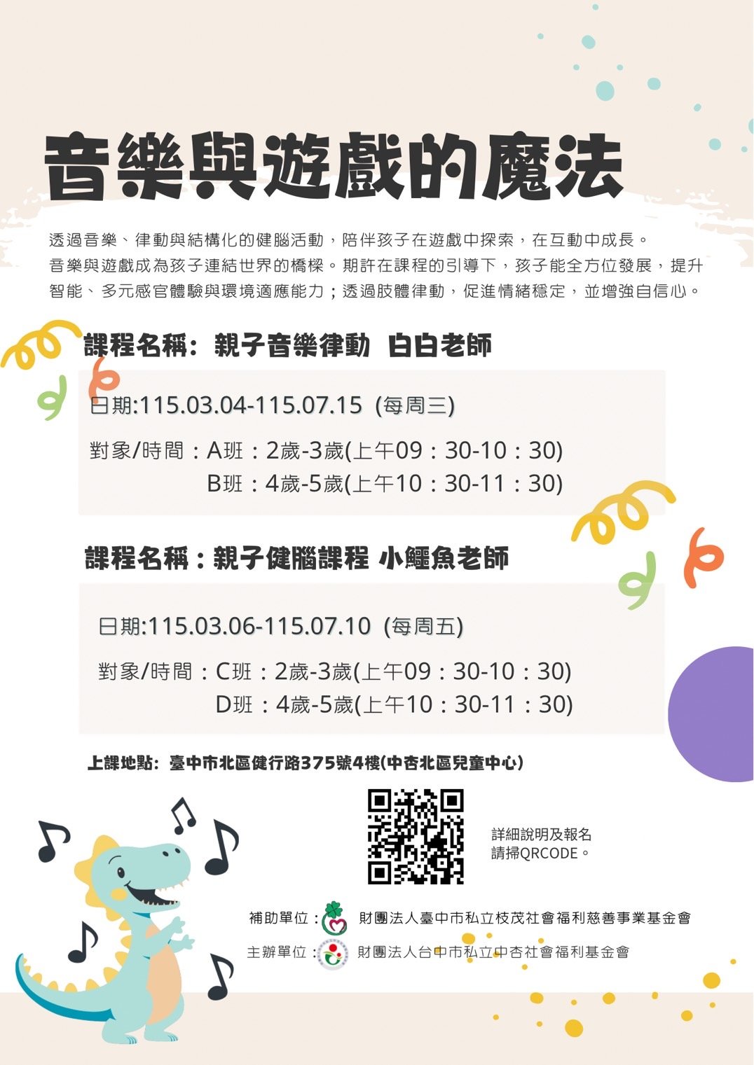 音樂與遊戲成為孩子連結世界的橋樑。期許在課程的引導下,孩子能全方位發展,提升智能、多元感官體驗與環境適應能力;透過肢體律動,促進情緒穩定,並增強自信心。