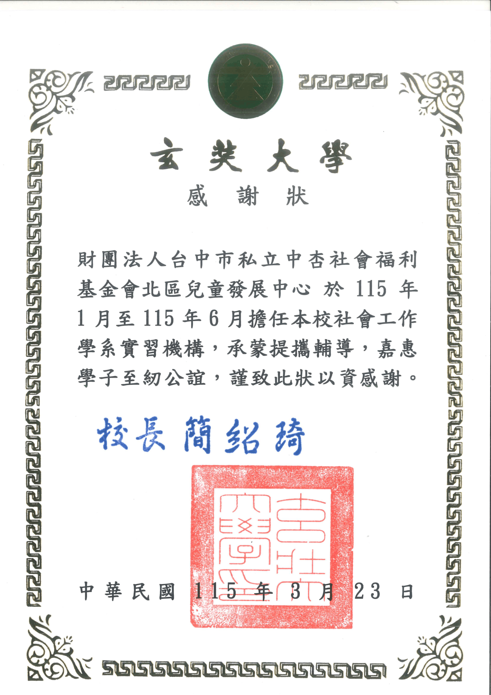 收到來自玄奘大學社工系的感謝狀!