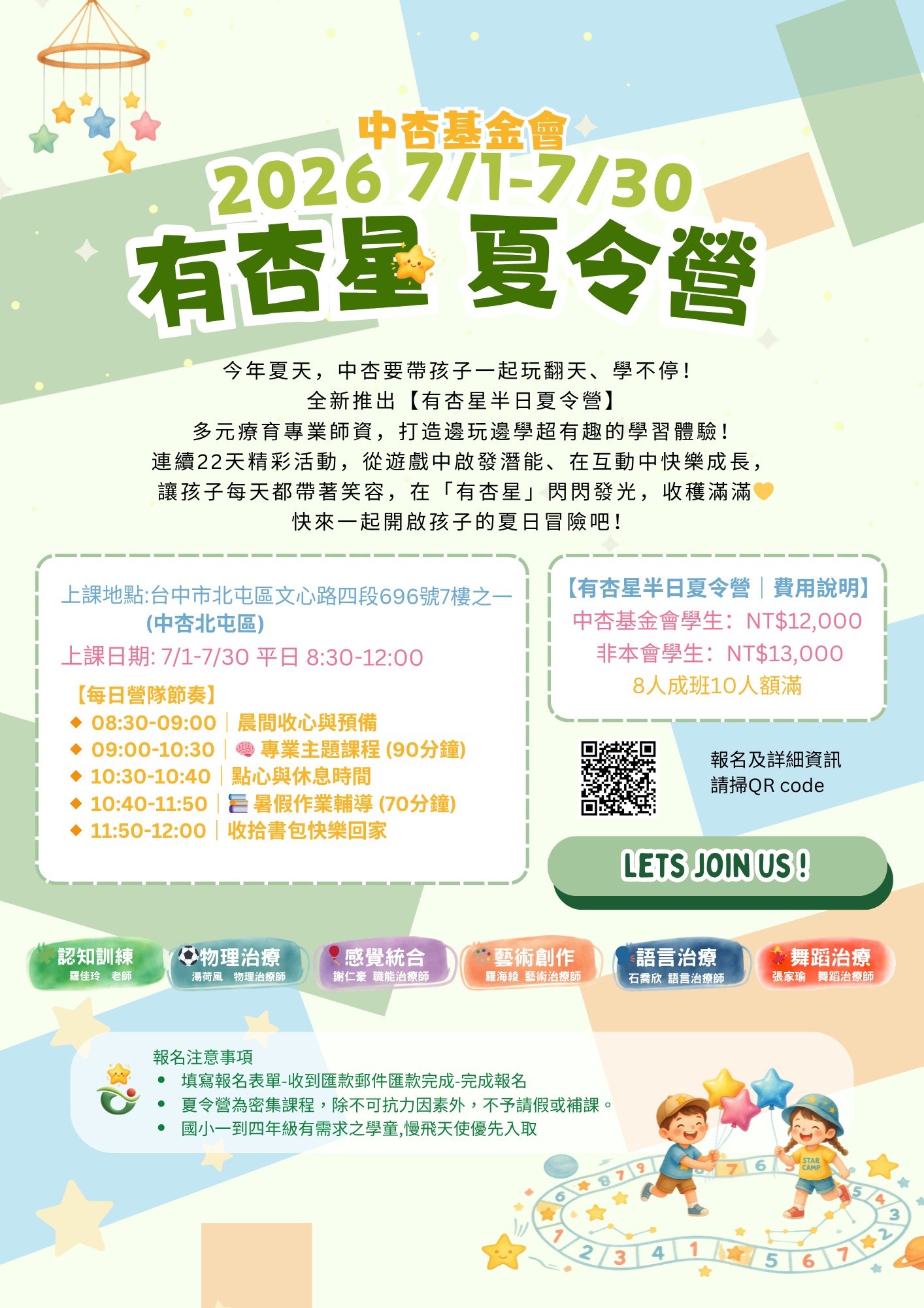 今年七月,中杏邀請孩子一起玩翻天、學不停!全新專屬特教孩子的半日夏令營來囉🚀