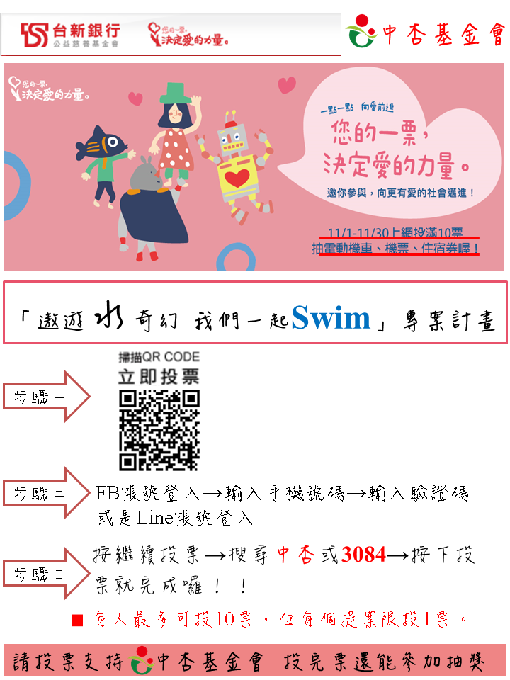 投票流程:點選登入→授權FB帳號→手機驗證→認明「遨遊水奇幻 我們一起Swim」提案或搜尋3084→投票!