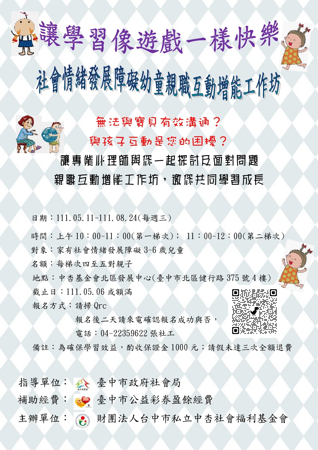 地點:中杏基金會北區發展中心(臺中市北區健行路375號4樓)